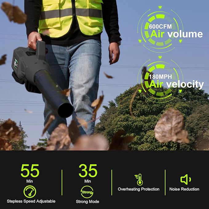 - Cordless Powerful Blower: Equipped with a robust 40V motor, this 40V leaf blowers for lawn care can provide a robust 600 CFM airflow and speeds of up to 180 MPH, 21000 RPM,making it the helpful tool for effective lawn care and debris removal
