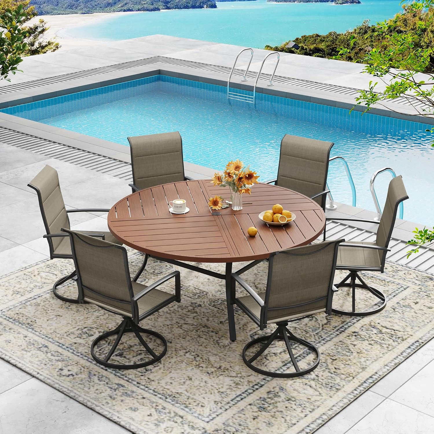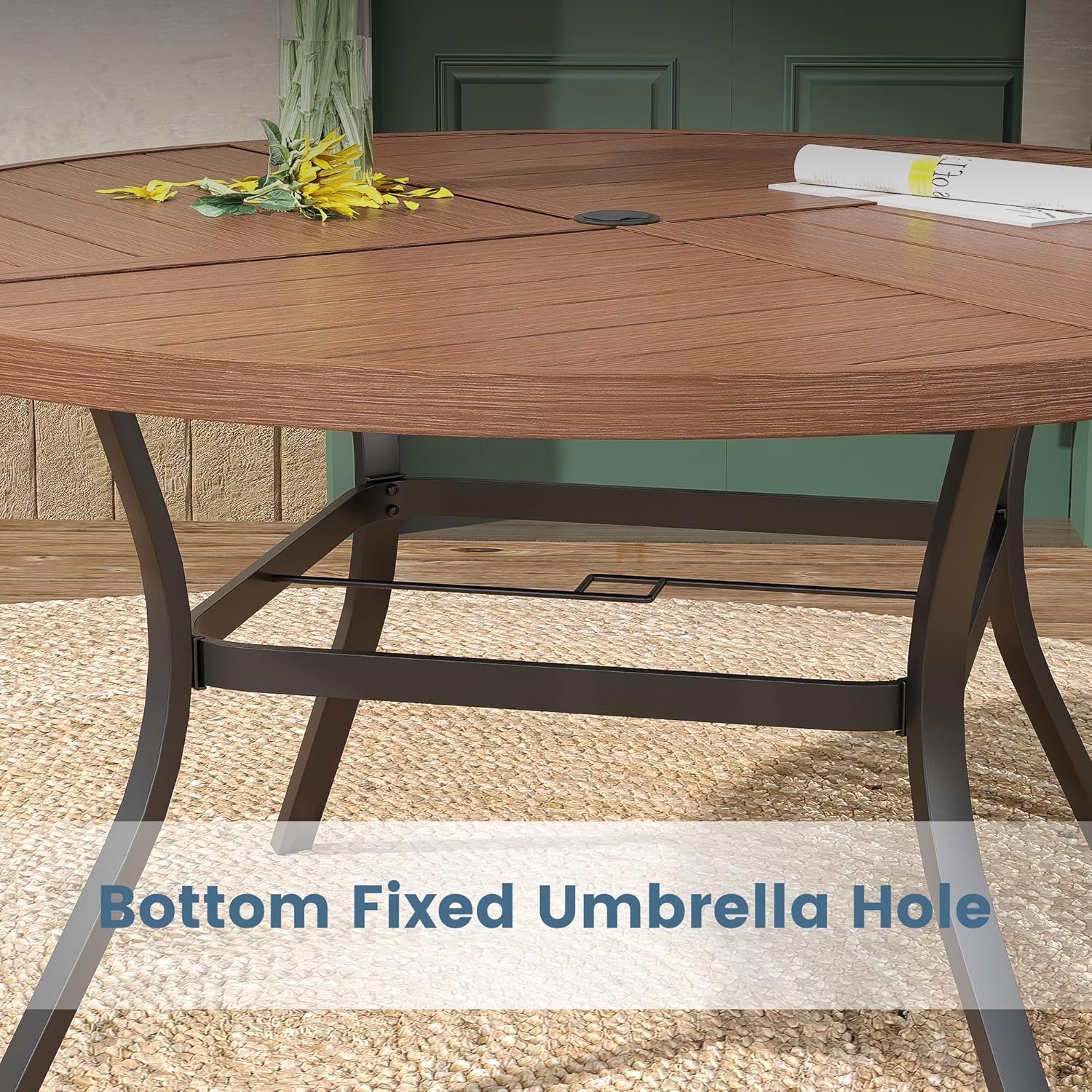 DIFY 53.1" Round Outdoor Patio Dining Table for 6-8, All-Weather Metal Steel Slatted Patio Table with 1.57" Adjustable Umbrella Hole, for Lawn Garden Porch Backyard, Walnut