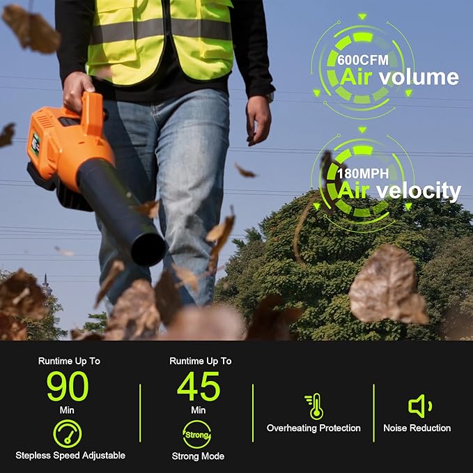 - Cordless Powerful Blower: Equipped with a robust 40V motor, this 40V leaf blowers for lawn care can provide a robust 600 CFM airflow and speeds of up to 180 MPH, 21000 RPM,making it the helpful tool for effective lawn care and debris removal