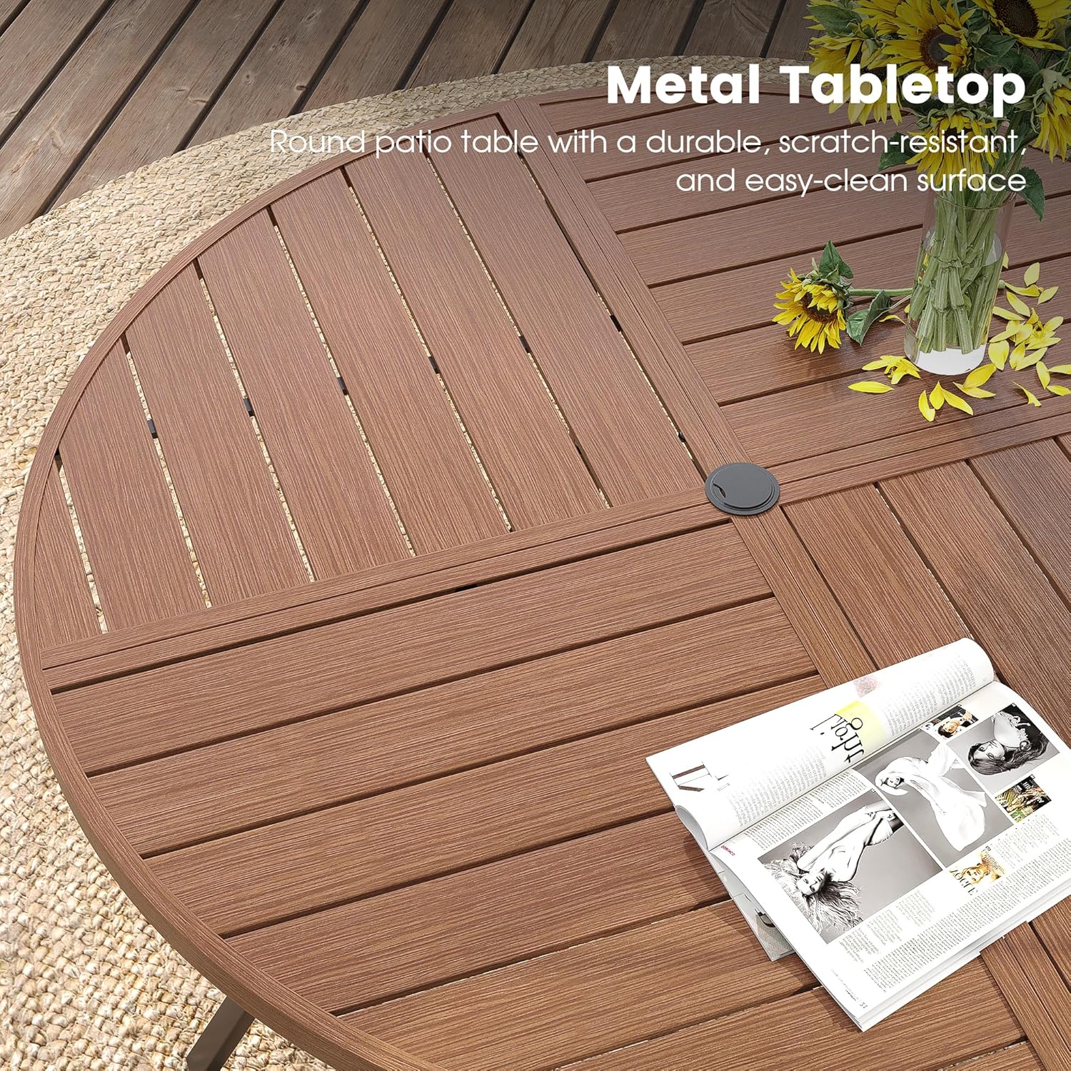 DIFY 47.2" Round Outdoor Patio Dining Table for 6, All-Weather Metal Steel Slatted Patio Table with 1.57" Adjustable Umbrella Hole, for Lawn Garden Porch Backyard, Walnut