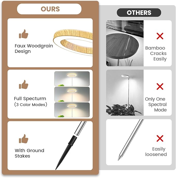 - Elegant Faux Woodgrain Design: This plant light has a unique faux woodgrain design that complements any interior space. Compared with other plant lamps using bamboo materials, ours will not crack or fall off. Whether itโs used as a light for indoor plants or adding a stylish content to your home decor, this plant lamp is both practical and beautiful