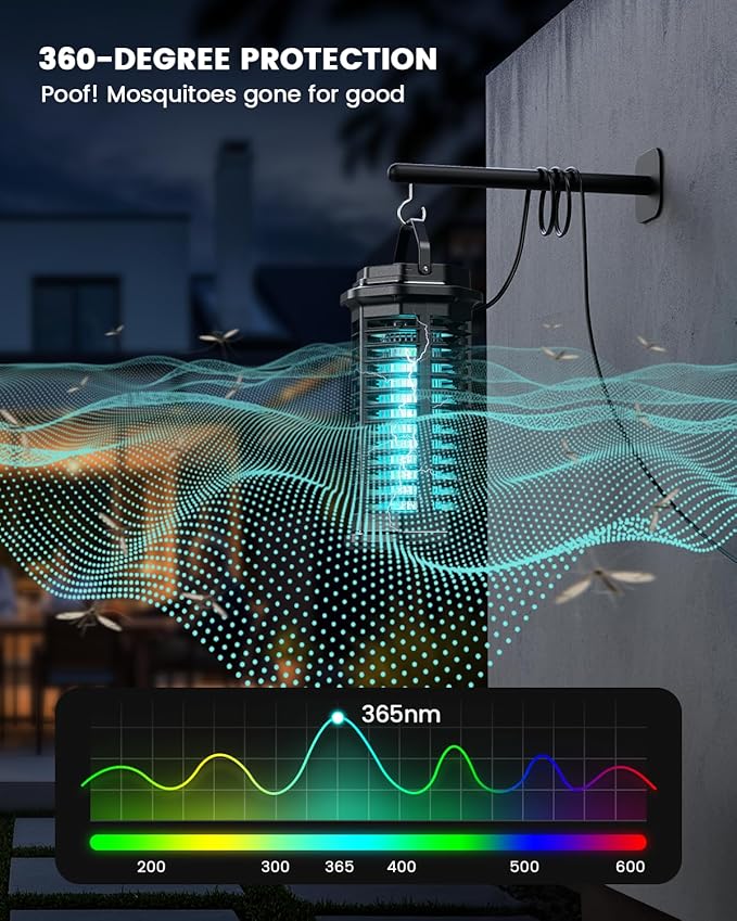 - 【High-Efficiency Mosquito Zapper】Equipped with a 15W ultraviolet bulb that effectively lures mosquitoes from up to 2,100 square feet, this insect zapper features a robust 4,200V electric grid to instantly terminate pests on contact—ensuring no escape and a mosquito-free environment