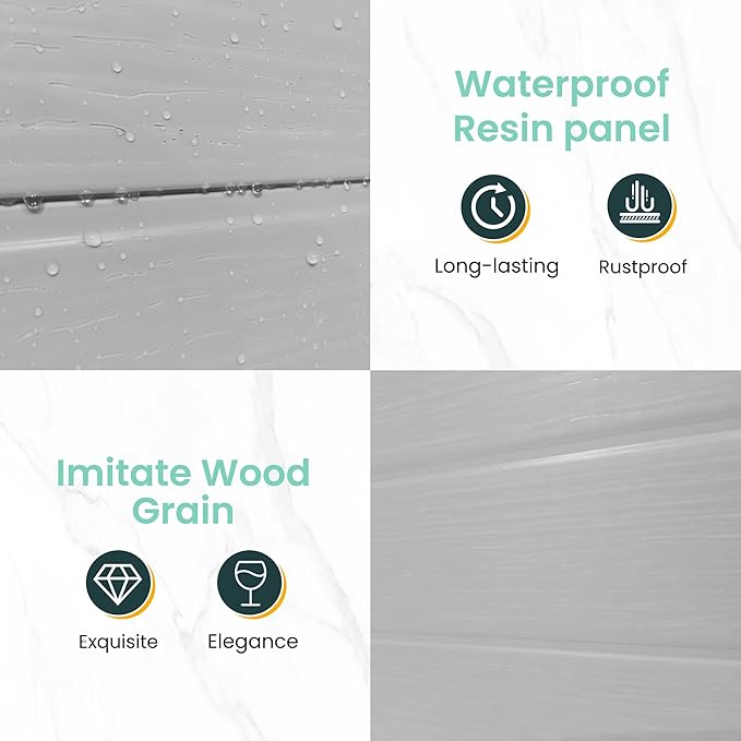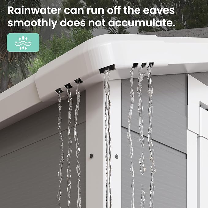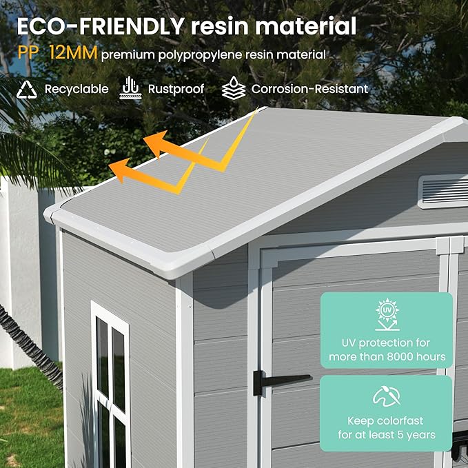 - RESIN MATERIAL: Our storage shed is crafted with 12MM premium polypropylene resin plastic, which is recyclable and eco-friendly. Resin shed is corrosion-resistant, waterproof, rustproof and with UV protection for more than 8000 hours, less bending and puncturing, worry-free for use in all weather conditions. It can be used daily for five years without fading