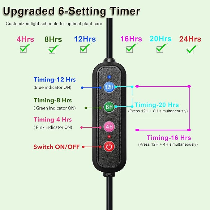 - [Upgraded 6-Timer Function with Memory] – This grow light features an enhanced timer offering 6 customizable settings: 4H, 8H, 12H, 16H, 20H, and 24H. Choose your preferred lighting cycle to match your plants’ needs, whether for short bursts or continuous light. The built-in memory function ensures the light automatically turns on and off each day at the same time, even after power loss—no need to reset daily. Ideal for busy plant enthusiasts seeking consistency and convenience.