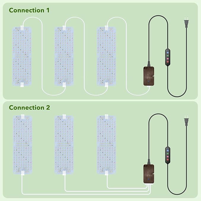 - [Modular LED Grow Panel with Daisy Chain Design] – This linkable grow light panel offers a professional solution for both hydroponic and green house. Easily connect up to 10 panels in series or parallel using the included 8.2ft power cord and 3.28ft link wires. Ideal for small to big indoor setups—whether a 3x3 or 4x4 grow tent, shelf, or commercial greenhouse.