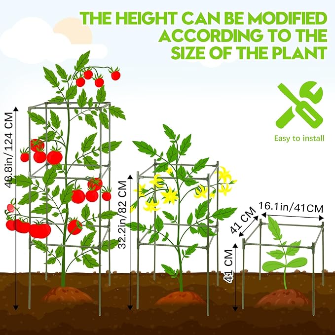 - [New design] The body of this adjustable tomato stand consists of four plant columns, combined with four and three way connectors. This unique design not only provides strong plant support piles, but also distributes the weight of the plants more efficiently, ensuring that the shelves do not collapse. Support structures of different heights and shapes are created according to the growth needs of plants and spatial conditions.