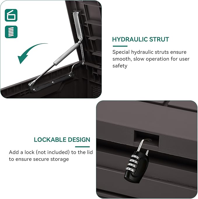- User-Friendly Design: This outdoor deck boxes are equipped with hydraulic struts for smooth and safe operation, as well as dual built-in side handles, making it easy to move around as needed