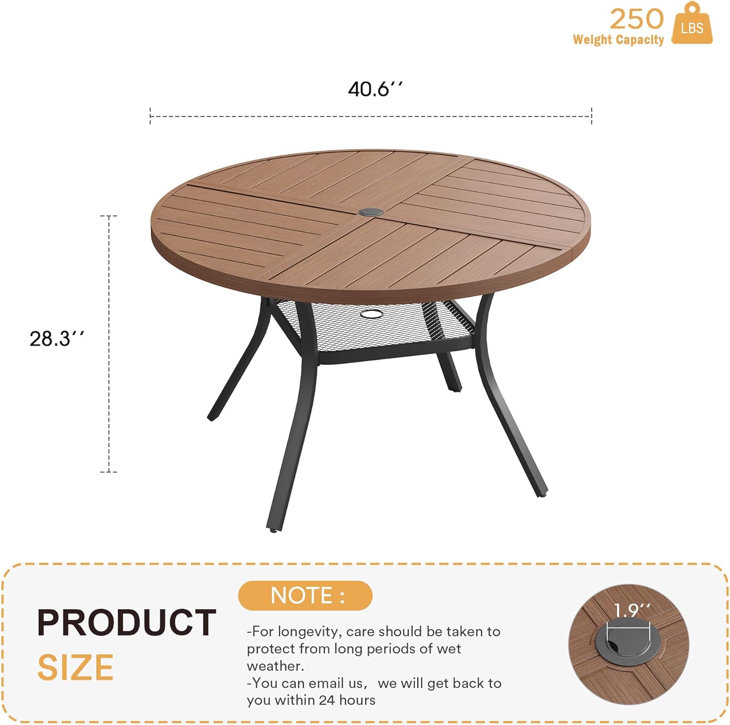 VICLLAX Round Patio Table with Adjustable Umbrella Hole for 4, All Weather Metal Outdoor Dining Table for Lawn Garden, 40.6" Outdoor Coffee Table, Walnut Wood-Like Tabletop