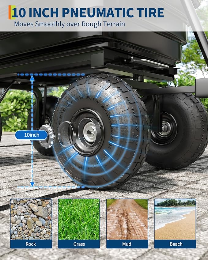 - All-Terrain Mobility: 10" puncture-resistant tires with deep treads conquer mud, gravel, and slopes, supported by steel-reinforced axle for stable movement