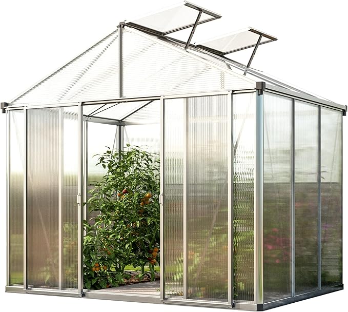 - PREMIUM GREENHOUSE with XL BONUS KIT: Thick polycarbonate panels, sturdy aluminum frame with reinforced hollow chamber profiles, stainless steel screws, 4 roof vents, 4 automatic vent openers