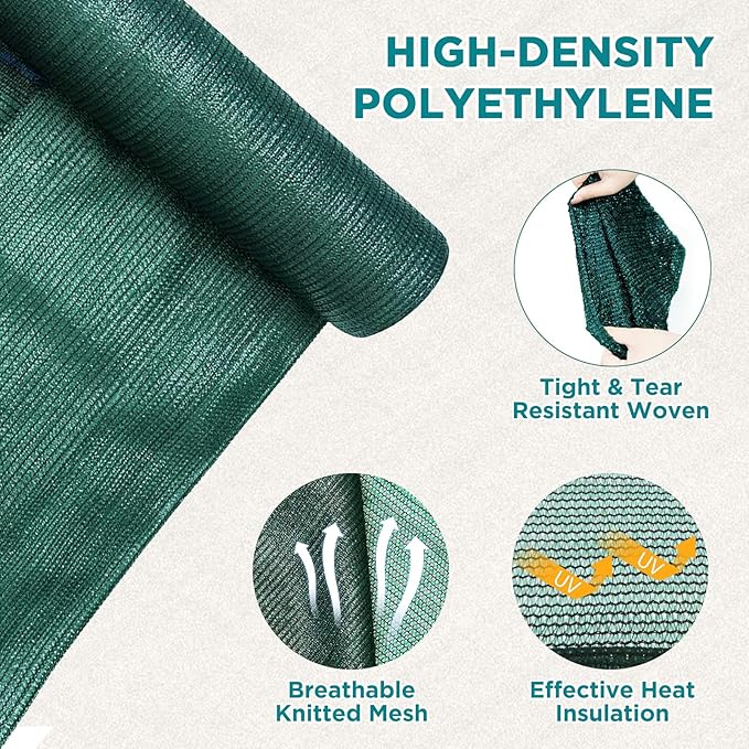 - The green shade cloth is made of 135gsm stabilized polyethylene (HDPE). It blocks 70% of UV rays to help keep plants from overheating and scorching while still allowing plants to receive the light they need.