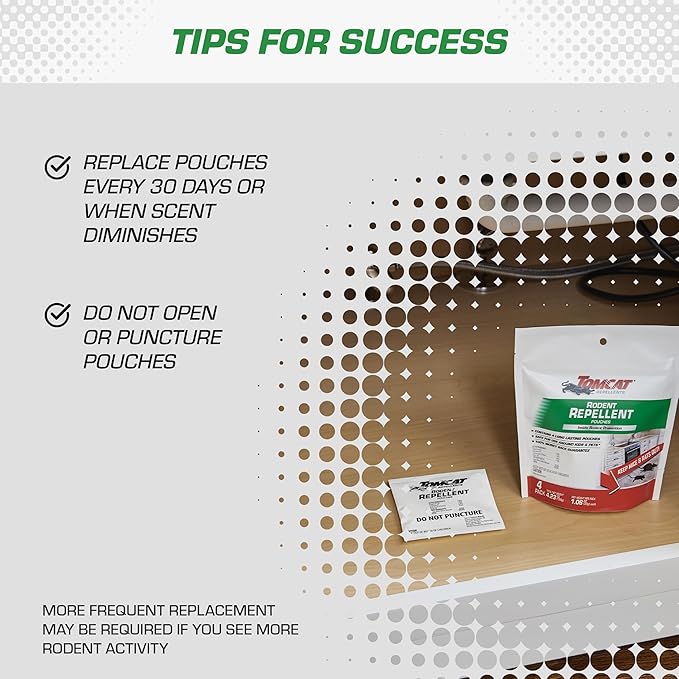 - Pest repellent is ideal for indoor use under sinks, in closets, storage bins, sheds, and garages, Tomcat Rodent Repellent Pouches offers an easy way to help repel rodents in your home