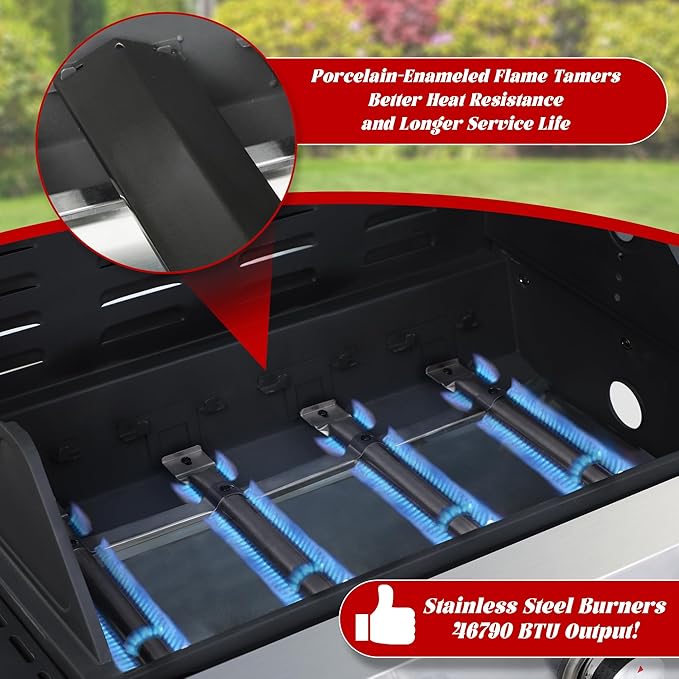 - Powerful 46,750 BTU Output: Equipped with four main burners (9,550 BTU each) and one side burner (8,550 BTU), and featuring a double-layer lid for heat retention and resistance, this grill delivers fast, even heating for perfectly grilled meals every time.