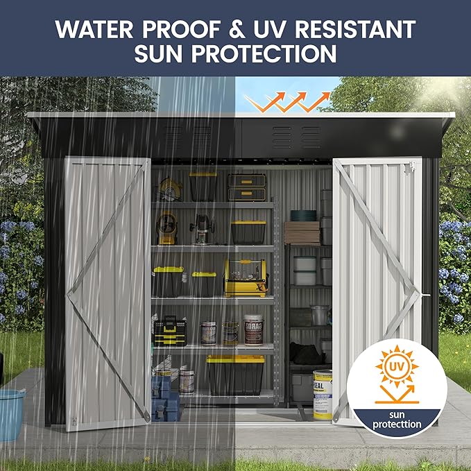 - Sturdy Storage Shed Thicker galvanized steel construction and fewer accessories makes this shed rustproof and UV-resistant. Overlapped wall panels features with waterproof and moister-resistant, worry-free for all weather condition use