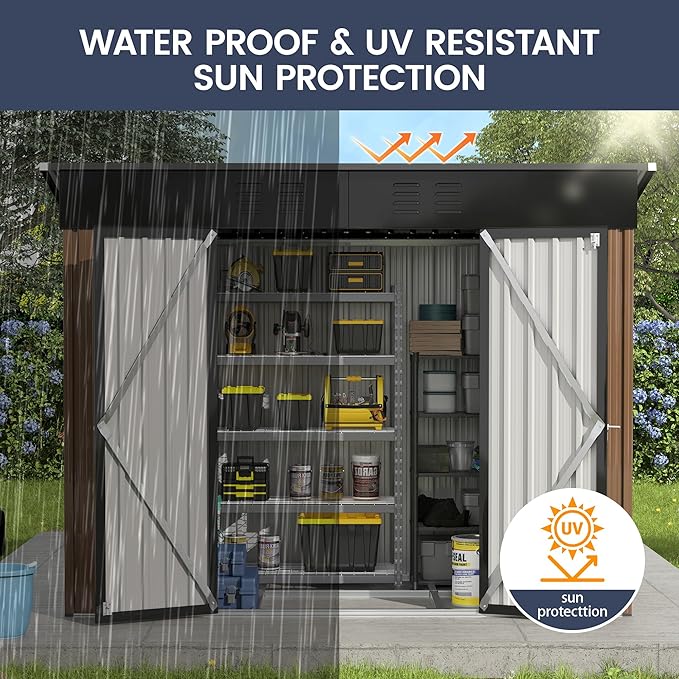 - Sturdy Storage Shed Thicker galvanized steel construction and fewer accessories makes this shed rustproof and UV-resistant. Overlapped wall panels features with waterproof and moister-resistant, worry-free for all weather condition use
