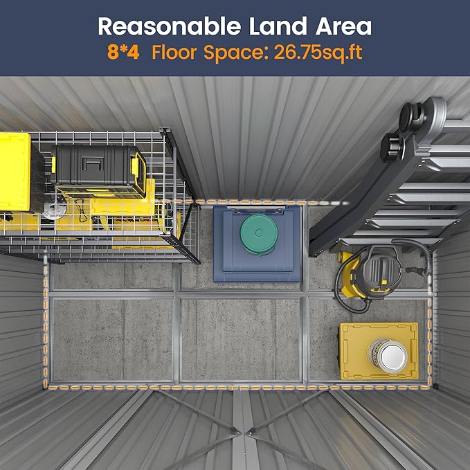- Spacious 8x4 Storage Sheds. This garden shed is perfect for storing snow blower, lawn mower, outdoor chair, large umbrella, fire pit, bikes, skateboards, trash can, kids' toys, generator and other items