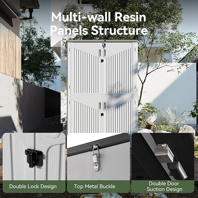 - 【Widened Anti-Toppling Base for Enhanced Stability】Designed with a widened bottom, this storage shed ensures superior stability, even on uneven ground. The top and bottom door suction system prevents accidental opening or closing, guaranteeing safety and durability during frequent use.