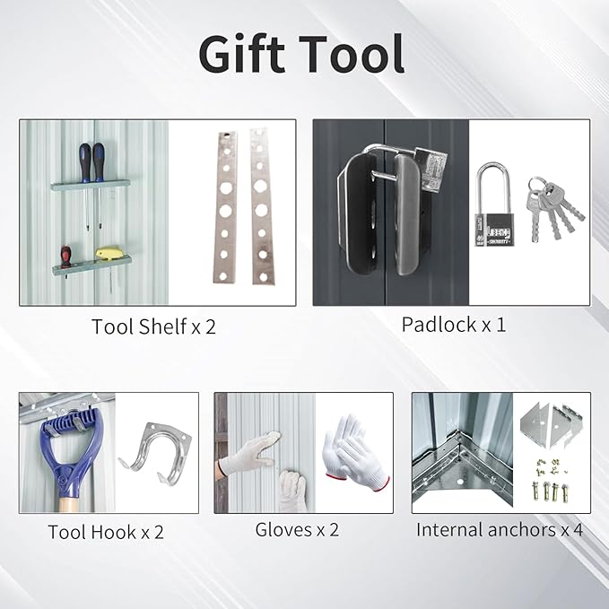 - ๐ก๐๐๐๐จ๐ซ๐ญ๐ฅ๐๐ฌ๐ฌ ๐๐ง๐ฌ๐ญ๐๐ฅ๐ฅ๐๐ญ๐ข๐จ๐ง: All accessories, including the padlock, tool hooks, tool shelves, gloves, and instruction manual, are neatly packed in a box. Every part in the package is pre-numbered for easy identification. The pre-cut and pre-drilled panels make assembly straightforward and hassle-free. With no prior experience required, you can effortlessly set up this utility backyard shed.