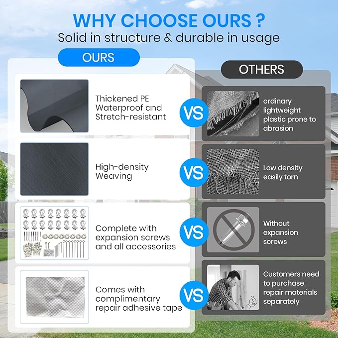- 【Waterproof All-Season Car Canopy】This all-weather car canopy features a reinforced triple-layered 180g polyethylene fabric that is tear-proof, waterproof, and UV resistant. The sturdy canopy cover is securely attached to the frame using elastic ball bungees and buckles, ensuring reliable protection for your vehicle and other items throughout the year. Besides, bonus repair adhesive tape is included for any necessary cover repairs.