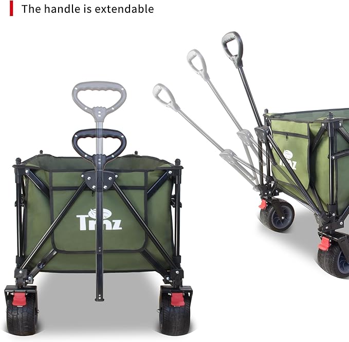 - ADJUSTABLE HANDLE FOR COMFORT: Our camping handcart has an ergonomically designed handle that is adjustable in height. Extended handle, no need to worry about foot collision with front wheel.
