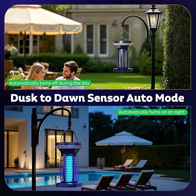 - 3-in-1 Bug Zapper with LED Lights & Auto/SOS Modes: This versatile device serves as a fly zapper, LED light, and emergency SOS tool. Use the mosquito lamp as a dimmable nightlight, camping lantern, or yard solar lights outdoor. It features an intelligent dusk to dawn sensor that automatically activates the fly killer based on surrounding light conditions. In emergencies, switch to SOS mode for a flashing light signal, ensuring safety during power outages or outdoor adventures