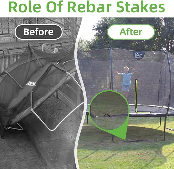 - 【Quality】Our Trampoline Rebar Stakes Crafted From Heavy-Duty Steel for Strength And Durability. They Feature A Black Powder Coating Galvanizing To Prevent Rust And Corrosion,Ensuring They Remain Reliable And Long-Lasting In Outdoor Use. These Ground Anchors Are Designed To Resist Weathering From Wind And Rain, Providing Years Of Service. Their Sturdy Construction Means They Won'T Bend Easily And Can Be Reused Multiple Times.