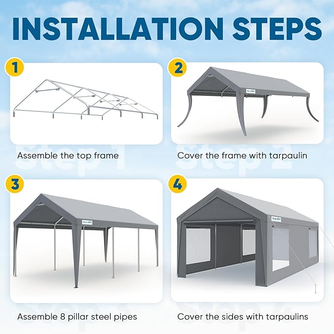 - 【Easy to Set up】One person can complete the installation of the carport within an hour, and it is recommended that two people install it faster and with less effort