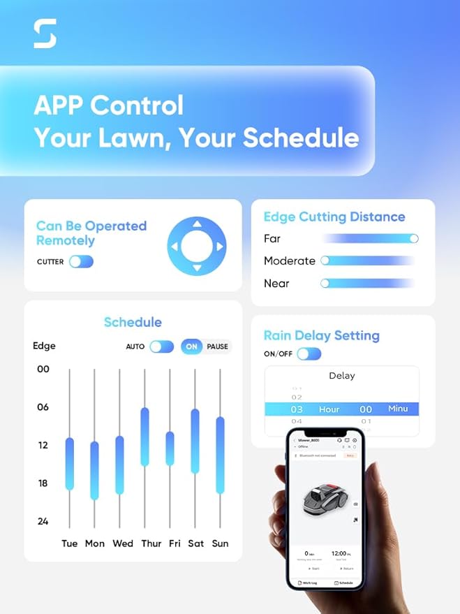 - SMART APP CONTROL & OTA UPGRADES: Manage your lawn care conveniently with the intuitive app. Schedule mowing times, adjust settings, and ensure your mower is always up-to-date with Over-the-Air upgrades, offering an automated, personalized lawn maintenance solution.