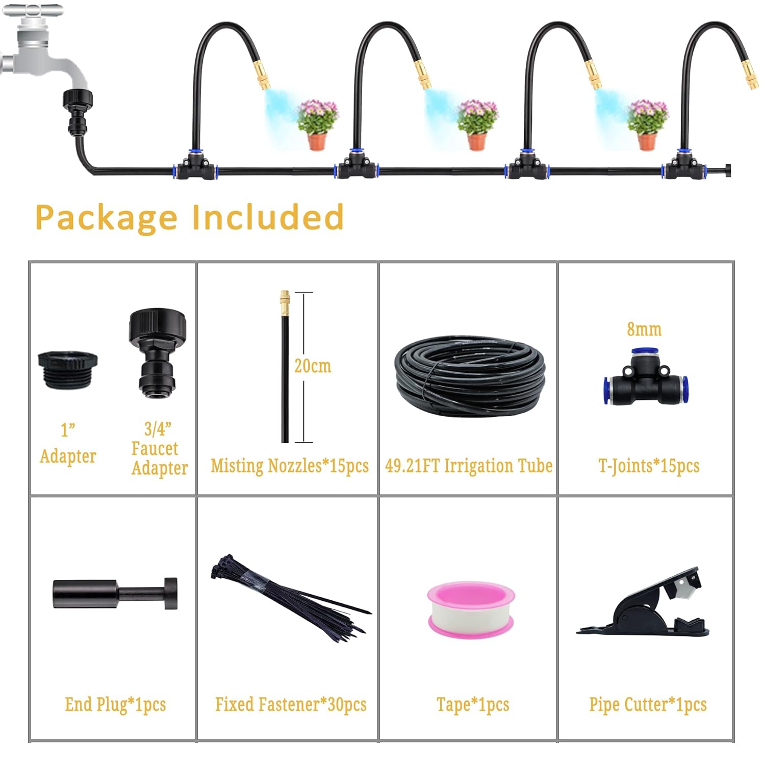 - 【Package Included】49.21Ft 8mm drip irrigation tubing system kit with 49.21FT irrigation tube, 15pcs of 360-degree bending atomizing copper nozzles, 15pcs of tees, 1pcs of universal faucet connector, a pipe cutter, ground pegs, and a bundle of cable ties.Meet your garden watering needs.