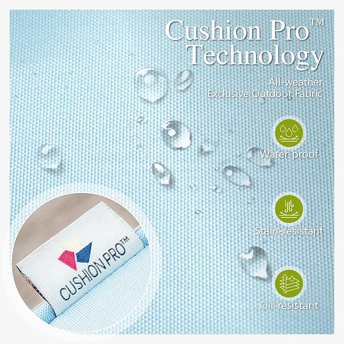 - 5.5" Thick Cushions: Metal outdoor patio furniture features 5.5" thick Cushion Pro outdoor fabric that is specially designed for outdoor use which has excellent water-repellent, oil-release, and stain-resistant properties, making it easy to clean with just a sponge and cleaning spray