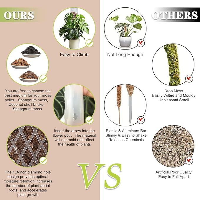 - Create a perfect growing environment: they are suitable for outdoor indoor use, using NASA homologous modified PP plastic, passed the -20β~80β extreme environment test, and the service life is 300% longer than natural moss sticks for indoor plants. Honeycomb structure design achieves 93% moisture permeability, eliminating the risk of water accumulation and root rot in ordinary plastic plant climbing poles