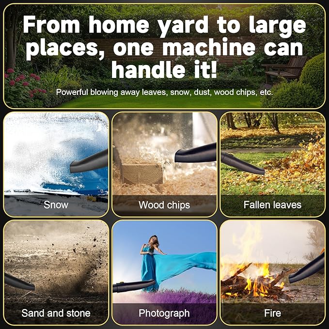 - 【High Power Electric Cordless Leaf Blower】Leaf blower has a powerful 400W motor, 190000 RPM, 6 adjustable speeds, specifically designed with 150 MPH & 500 CFM to safely remove debris without creating harmful particles. Effective snow, dust and leaf removal, from clearing garages, sidewalks, yards, parks and parking lots