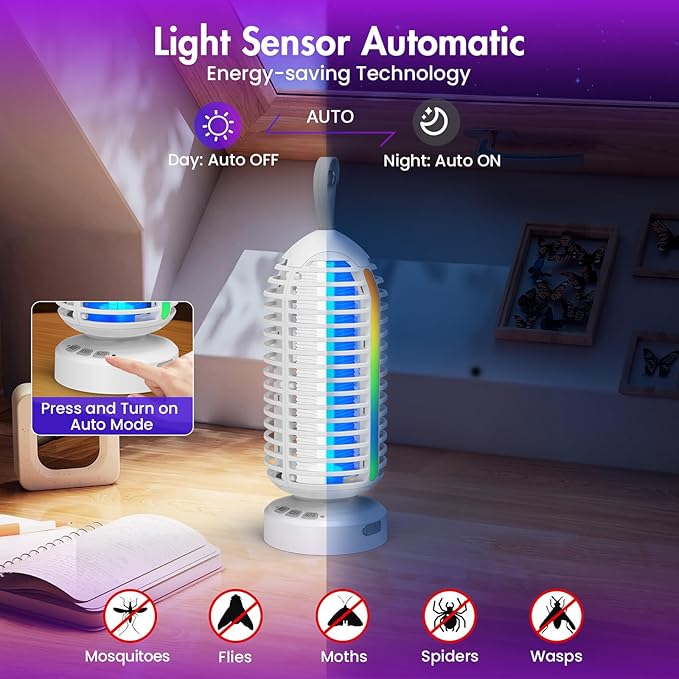 - High-Capacity Battery & Portability: Equipped with a 4000mAh battery, this bug zapper provides up to 16 hours of continuous use on a single charge via Type-C USB. Portable design allows you to place this mosquito zapper anywhere without the hassle of cords, making it perfect for both indoor and outdoor use