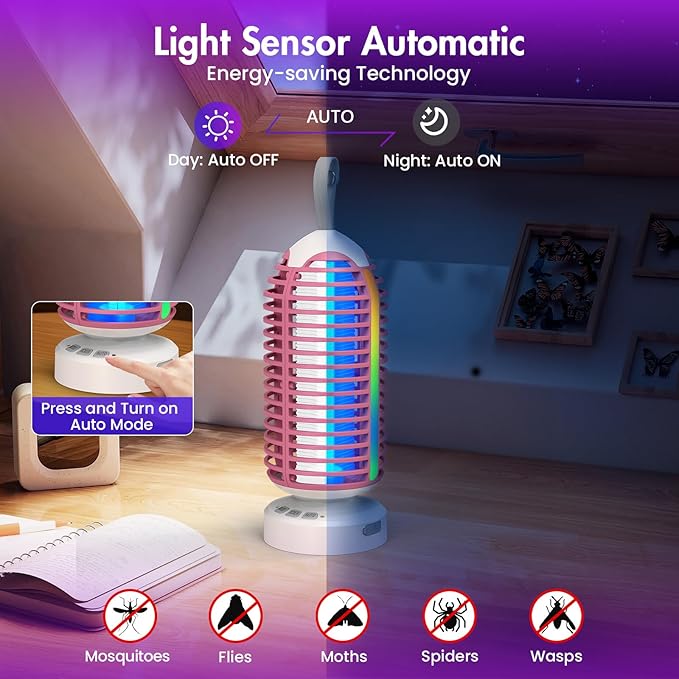 - High-Capacity Battery & Portability: Equipped with a 4000mAh battery, this bug zapper provides up to 16 hours of continuous use on a single charge via Type-C USB. Portable design allows you to place this mosquito zapper anywhere without the hassle of cords, making it perfect for both indoor and outdoor use
