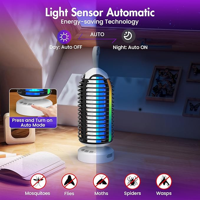 - High-Capacity Battery & Portability: Equipped with a 4000mAh battery, this bug zapper provides up to 16 hours of continuous use on a single charge via Type-C USB. Portable design allows you to place this mosquito zapper anywhere without the hassle of cords, making it perfect for both indoor and outdoor use