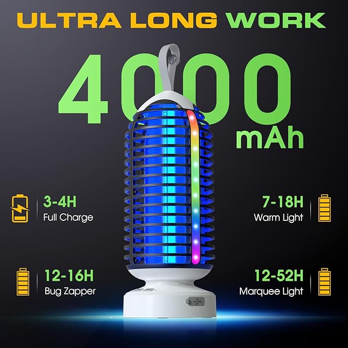 - Fast Charging and Long Battery Life: The camping bug zapper Equipped with a 4000mAh rechargeable battery, this rechargeable bug zapper charges in just 3–4 hours and delivers up to 16 hours of continuous protection, perfect for worry-free indoor or outdoor use, even during camping trips.