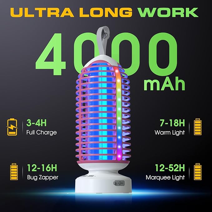 - Fast Charging and Long Battery Life: The camping bug zapper Equipped with a 4000mAh rechargeable battery, this rechargeable bug zapper charges in just 3–4 hours and delivers up to 16 hours of continuous protection, perfect for worry-free indoor or outdoor use, even during camping trips.