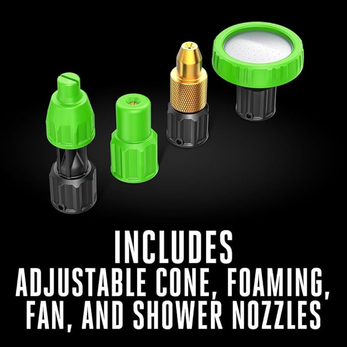 - Includes adjustable cone, foaming, fan, and shower nozzles