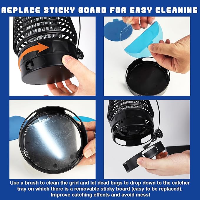 - EASY TO USE & CLEAN: This device must be PLUGED IN and press the ON/OFF button to turn it on to start use. Before use, a sticky board is supposed to be applied to the bottom tray to improve catching and avoid mess. After use, clean the grid with the small brush and let dead bugs to drop down to the sticky board, and then you just need to replace the sticky board.