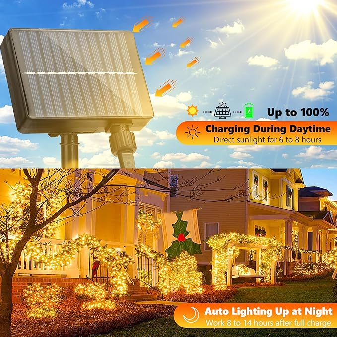 - Solar Powered and Auto On/Off: These solar string lights use solar energy, eliminating extra costs and battery replacements. A light sensor automatically turns the lights on at dusk and off at dawn