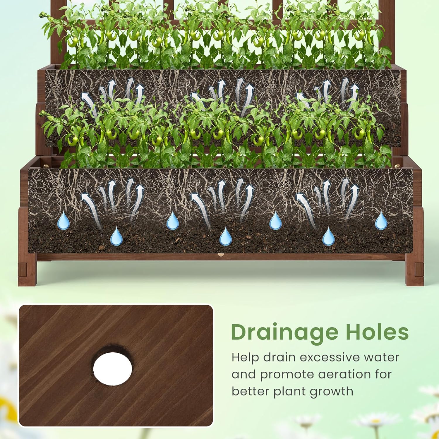 HAPPYGRILL Raised Garden Bed with Trellis, Drainage Holes, 2-Tier Wooden Elevated Planter Box w/Legs for Climbing Plants Vine Flower Herb Vegetable Fruit, Outdoor Garden Box for Patio Balcony (2)