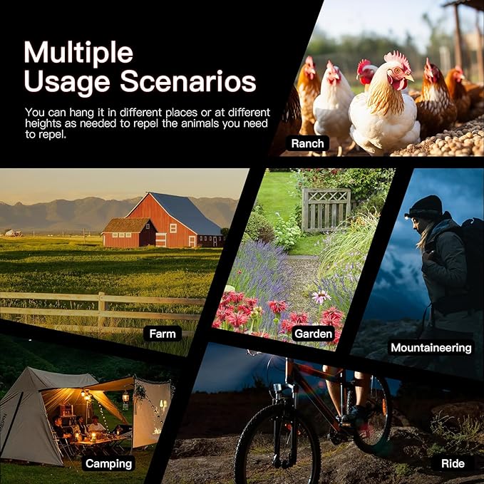 - Special Purpose: This multifunctional coyote deterrent is not only ideal for gardens, farms and pastures, it can also play a role in a variety of special scenarios. When crawling at night, hang it on your body to improve your safety. When riding at night, become your car's taillight reminder to the rear. When camping, it can become your camp guard. When used as a hazard warning light, its high-brightness strobe light can quickly attract attention and effectively prevent accidents.