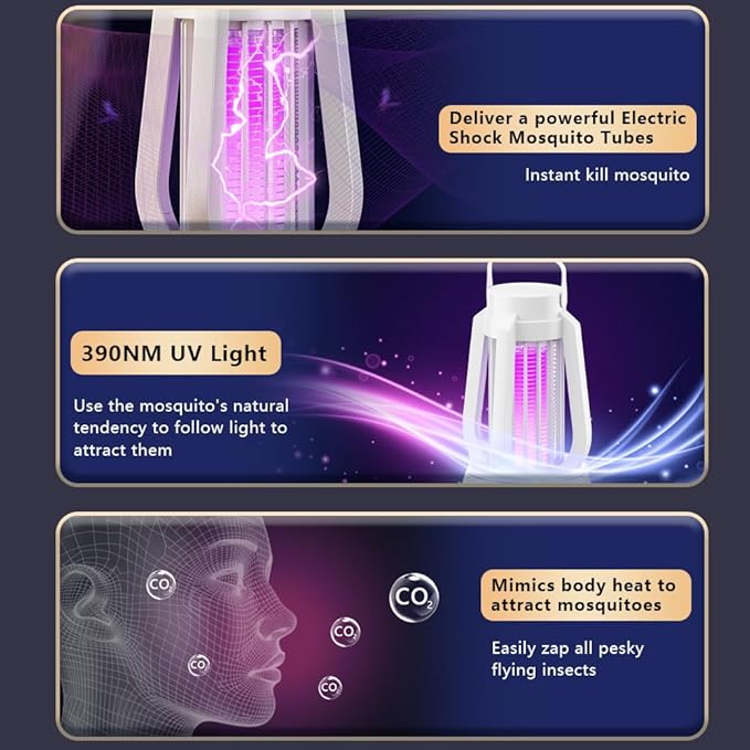 - 3-in-1 Bug Zappers – Switch between Mosquito Trap, Night Light, and Camping Lamp with one tap! Purple lamps attract and electrocute flying insects, warm light for peace and quiet, and bright white illuminates tents. Flying Insects Zapper is perfect for bedrooms, patios, and camping.