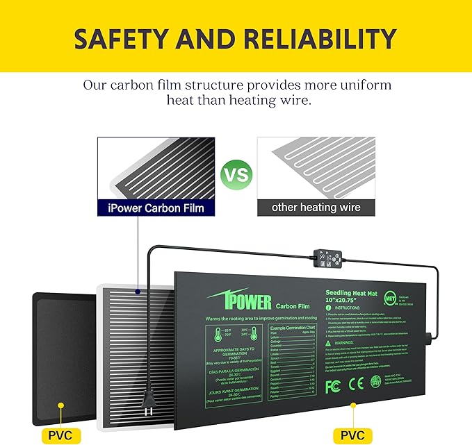 - Durable & Waterproof for Safe Use: Made with high-quality materials and meets MET standards, this waterproof seedling heat mat has an IP67-rated surface for easy cleaning. Insulated wiring and reinforced connections enhance safety and durability