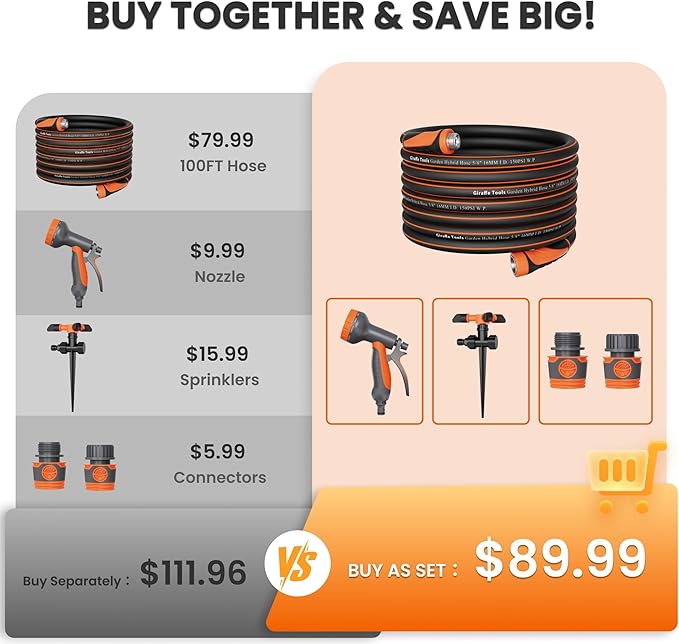 - Get the Hose Kit for Less Than Separately: Includes 100Ft 5/8" garden hose, 10-pattern spray nozzle, ground spike, and 3/4" quick connect adapters - everything needed for effortless watering, car washing, and outdoor cleaning. Get everything you need for garden watering in one convenient set and save more than getting it individually.