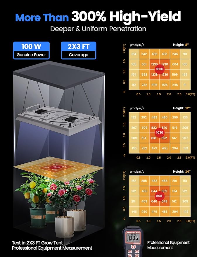- 【Powerful 100W LED】: Unlike other products with exaggerated claims, our Smart Plant Light boasts a genuine 100-watt LED with 8 adjustable brightness levels and a patented light spectrum. This full spectrum grow light delivers exceptional PPFD performance, accelerating plant growth by up to 200% compared to traditional plant lights. With a 2x3 ft coverage area, it maximizes your gardening efficiency, making it perfect for a 2x2 grow tent and ensuring your plants thrive faster and healthier.