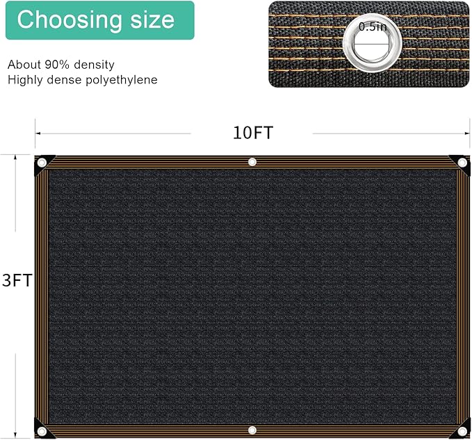 QNLONG Shade Cloth for Garden, 90% Black Shade Net Mesh Tarp with Grommets Sun Shade Cover Tear Resistance for Plants Greenhouse Chicken Coop Vegetables Pergola 3X10FT