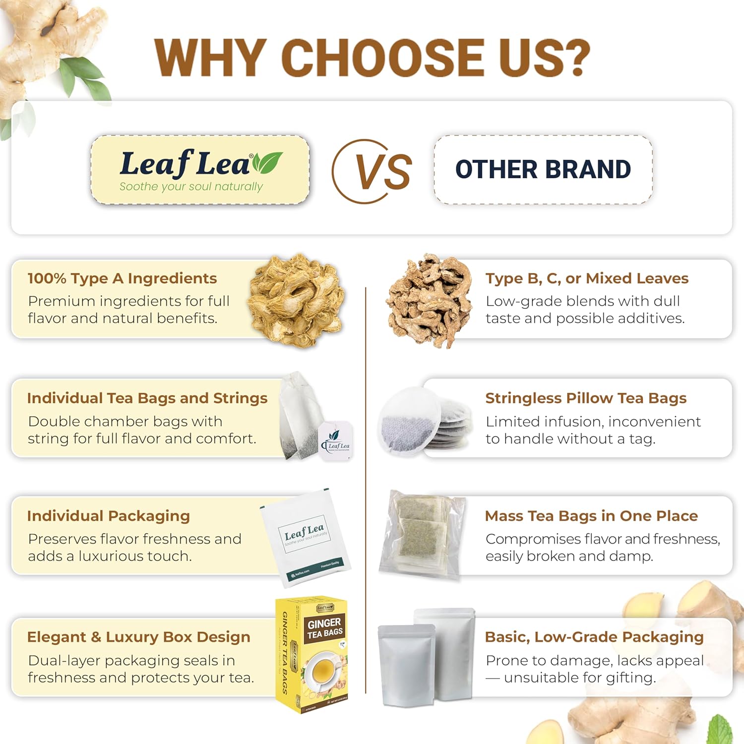 LeafLea 100% Pure Ginger Root Tea Bags – Spicy & Warming Herbal Tea, Supports Digestion & Immune Health, Individually Wrapped, Non-GMO, Caffeine Free, Sugar Free, No Gluten