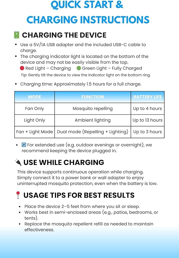 - Effortless operation. Embrace simplicity with a one-button design, making mosquito repelling a straightforward task. Press the power button to activate the fan that disperses the natural essence. The rapid charge feature coupled with up to 4 hours of battery life ensures you stay protected for extended periods without a hitch