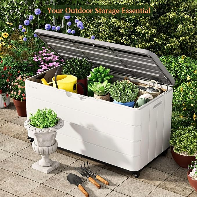 - 【Roll It Where You Need It】Dual heavy-duty wheels glide smoothly over decks and grass, no heavy lifting! Move seasonal items to the garage or shift the box to clean under it easily